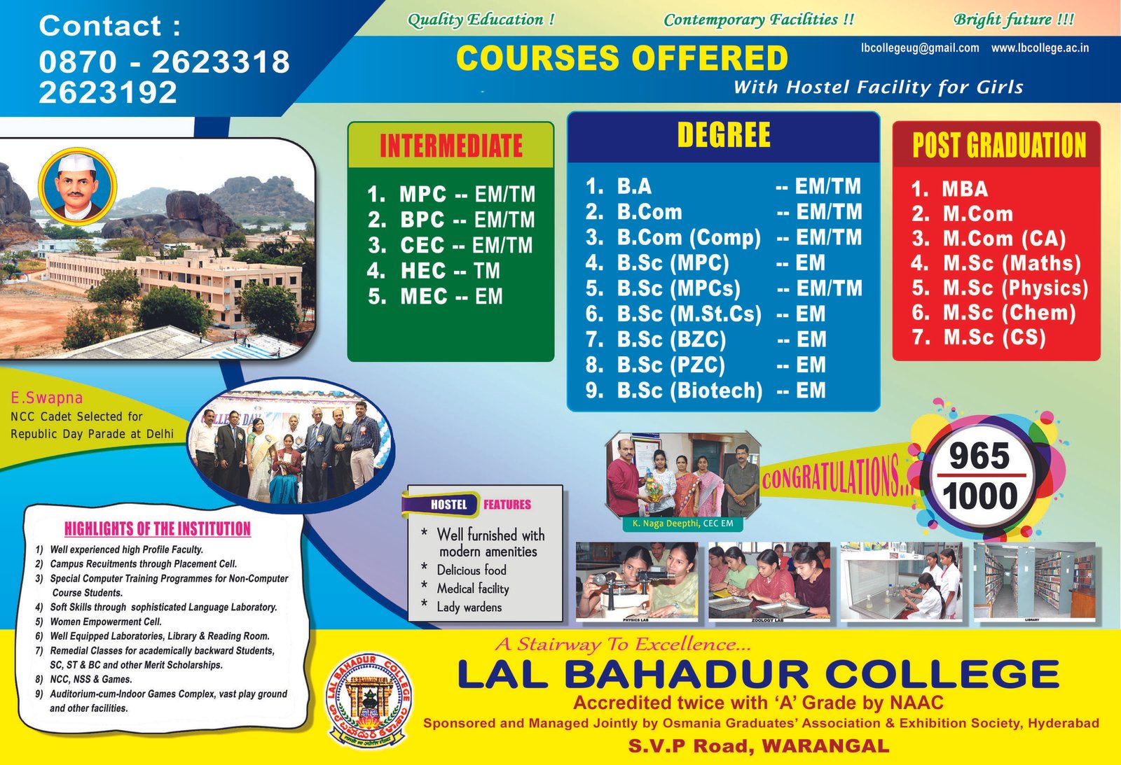 Lal Bahadur College, Warangal is easily accessible to all as it is centrally located in an ideal environment between Hanamkonda and Warangal towns. The college has tidy natural surroundings with scenic beauty and picturesque atmosphere which promotes healthy attitude among the students.